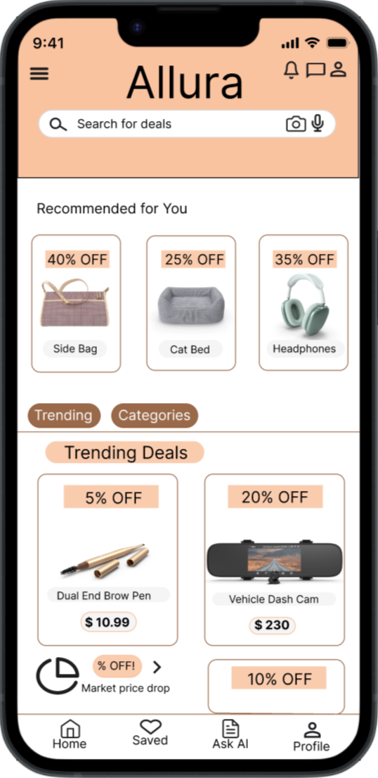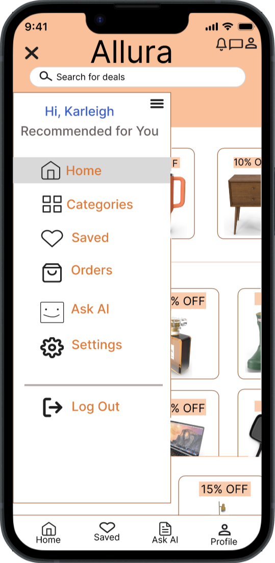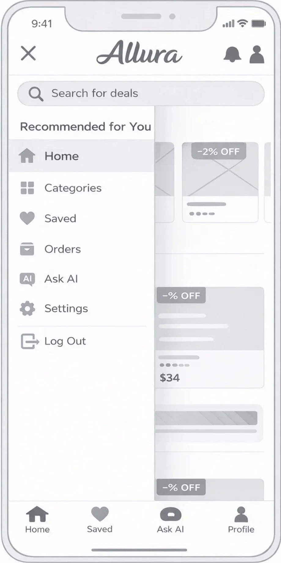 To organize the AI assistant feature within the Allura app, I created a sitemap to map out the structure and flow of the experience. This allowed me to visualize how users would access the assistant, how conversations could guide them to products or deals, and how the assistant connects to other areas of the app. Developing the sitemap early in the process helped establish clear information architecture and ensured that the feature would integrate smoothly into the overall user journey before moving on to wireframes and higher-fidelity designs.Wireframe & hi-fi mockup #1