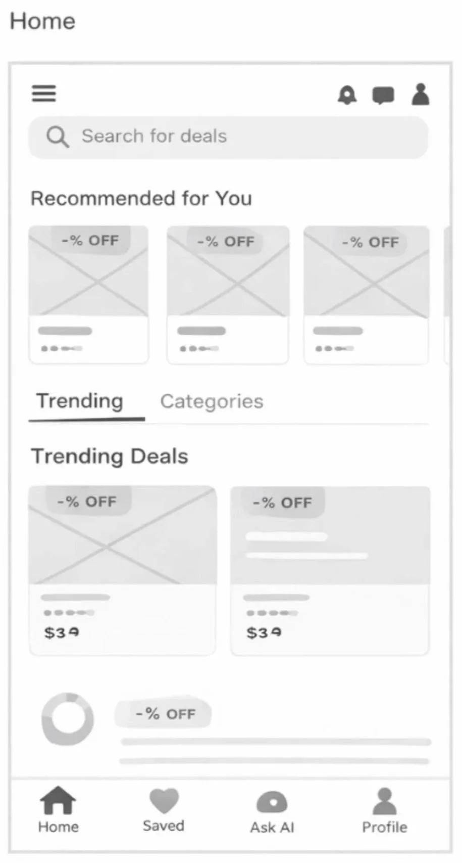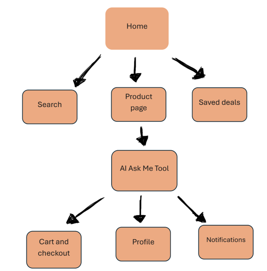 During the ideation stage, I explored multiple concepts through quick hand-drawn sketches to visualize potential features that could help users find better deals while shopping. Sketching allowed me to rapidly translate ideas from brainstorming into tangible interface concepts without committing to high-fidelity design too early in the process.Two concepts emerged from this exploration. The first was an AI-powered shopping assistant designed to guide users through the platform, help them discover products, and recommend deals based on their preferences. The second concept was a “Spin the Wheel” feature, a gamified experience where users could spin a wheel to unlock discounts and promotional offers.After evaluating both ideas, I chose to move forward with the AI assistant concept. While the spin-the-wheel idea added an element of fun, the AI assistant offered a more practical and scalable solution. It could provide personalized recommendations, help users quickly locate products, and surface relevant deals in a way that improves the overall shopping experience.These early sketches helped clarify the direction of the product and served as the foundation for the wireframes and design iterations that followed.Sitemapping