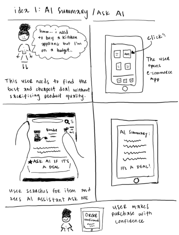 This exercise produced a wide range of potential features, including price-drop notifications, loyalty rewards, deal bundles, and countdown flash sales. I also explored more advanced concepts such as AI-powered price negotiation, alternative product suggestions, and price prediction tools that could advise users on whether to buy now or wait for a better deal.