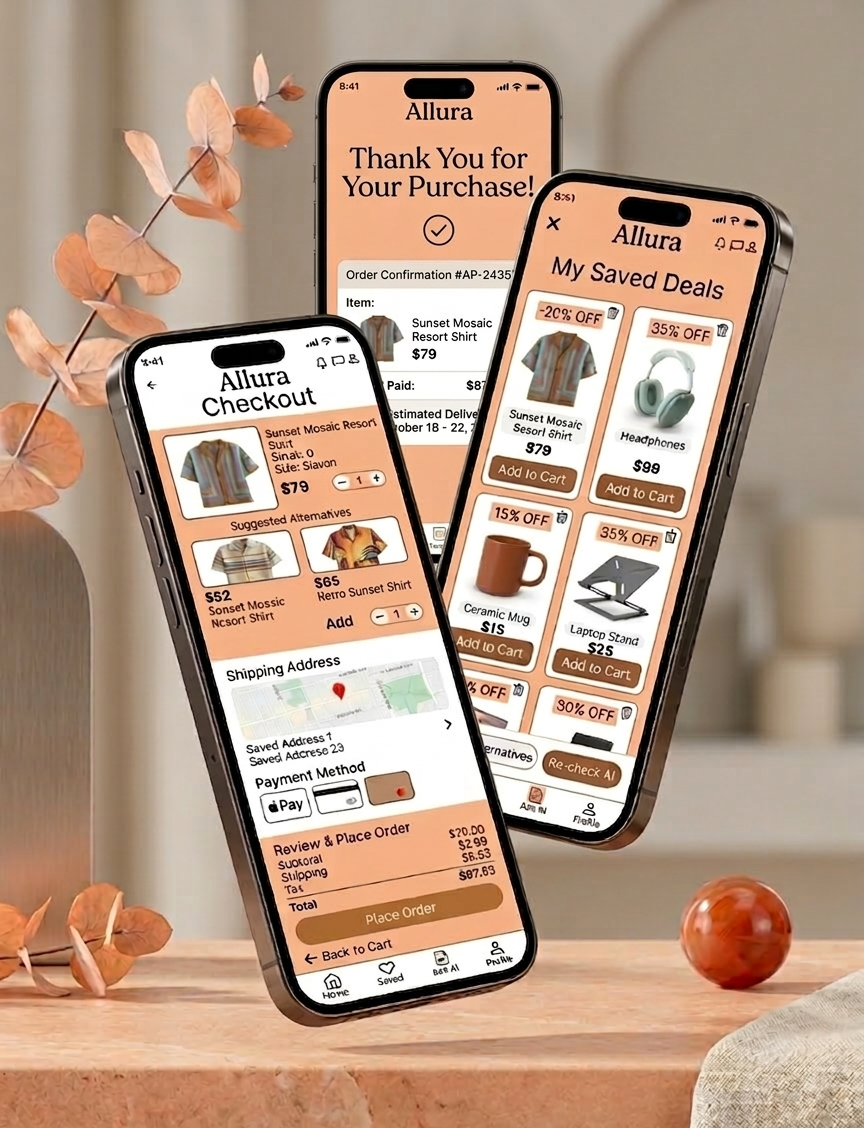 Allura is a modern e-commerce app concept focused on seamless product discovery and intuitive shopping. I designed the experience from wireframes to high-fidelity mockups, exploring how clean navigation, thoughtful layouts, and AI assistance can simplify the online shopping journey.