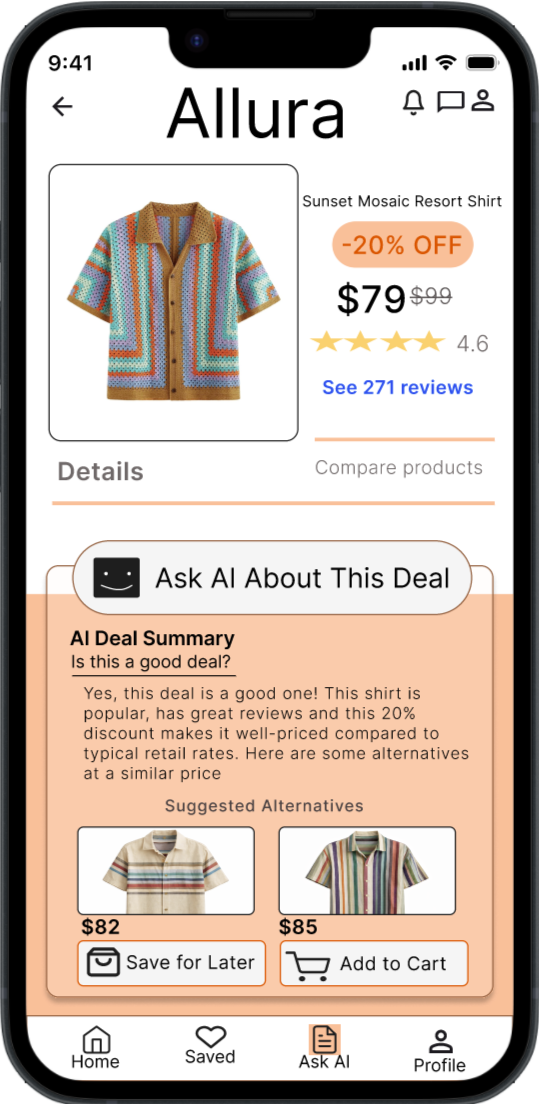 Before designing Allura, I conducted short user interviews to better understand how people currently shop online and what frustrations they experience with e-commerce platforms. My goal was to uncover pain points, habits, and expectations that could inform the design of a more intuitive and personalized shopping experience.