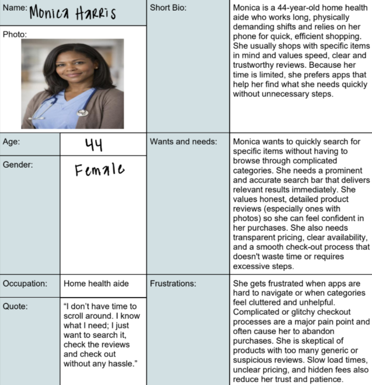 Monica is not only looking for speed and efficiency in her shopping—she’s also focused on finding good deals. She wants to make every purchase count, balancing value with convenience. To design a shopping app that feels intuitive and effective, I created Monica, a 44-year-old home health aide, to represent users who are time-constrained, goal-oriented, and deal-savvy.I created Monica by analyzing common frustrations in mobile shopping apps, such as cluttered navigation, slow searches, and unclear pricing, combined with insights from her lifestyle and priorities. Her persona highlights what drives her shopping decisions: speed, confidence, and value.