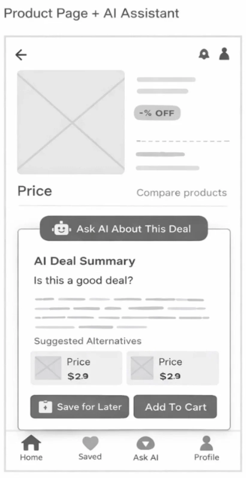 Interview insights showed that users want more than a smooth checkout—they want confidence that they’re making the best purchase for the price. Many participants said they often compare options before buying and value clear information that helps them feel they’re getting the best deal. At the same time, users mentioned frustration with overwhelming choices and irrelevant recommendations, highlighting the need for a shopping experience that feels simple, trustworthy, and price aware.
