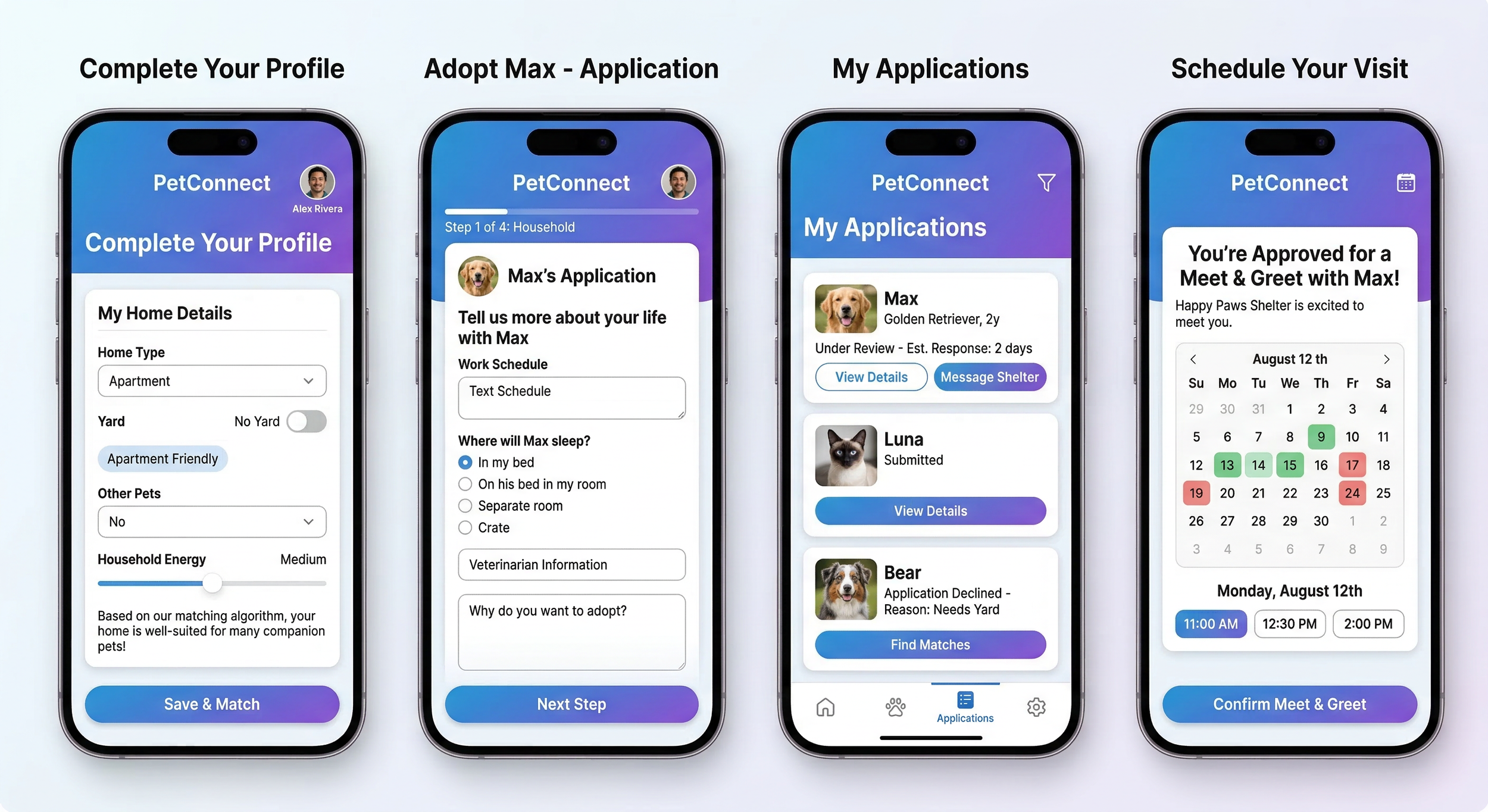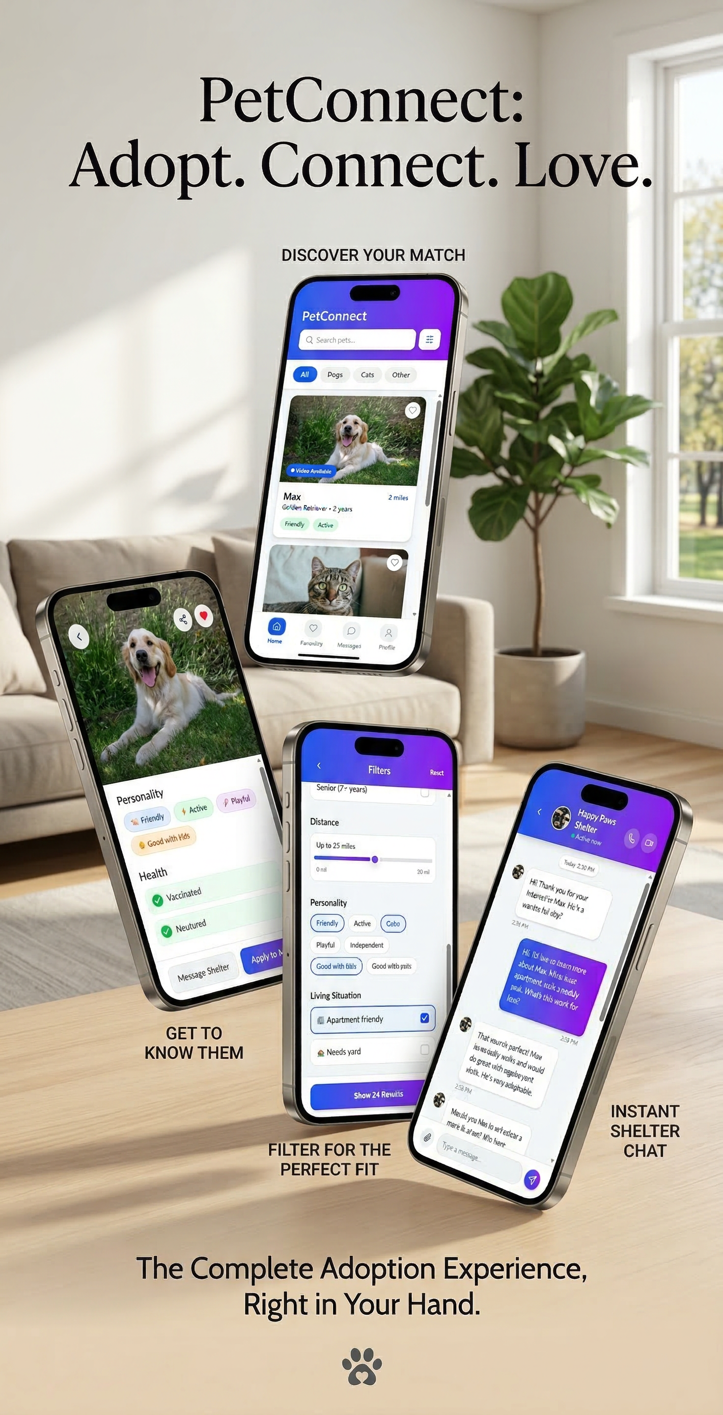 PetConnect is a mobile platform designed to simplify and centralize the pet adoption process, addressing the frustrations of fragmented applications and inconsistent shelter requirements