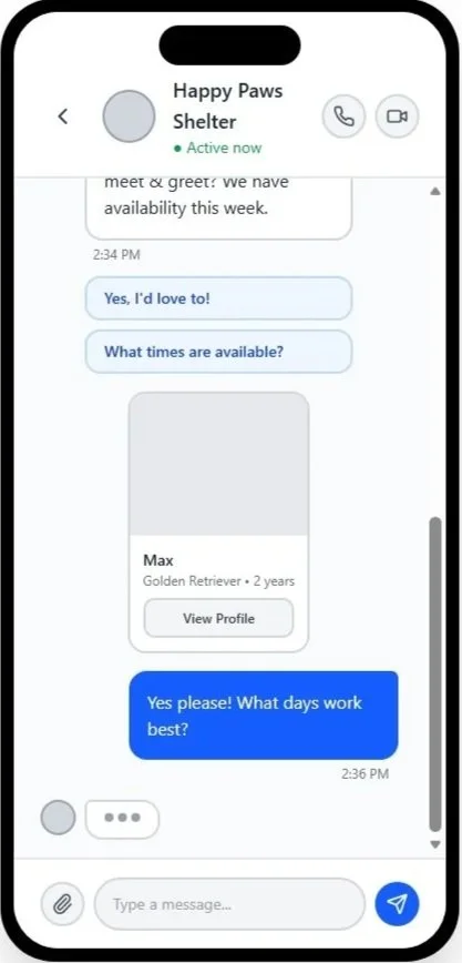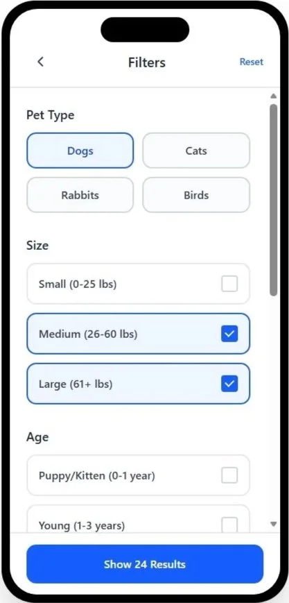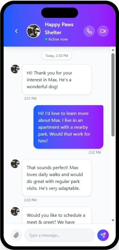 The design incorporates a clean layout, approachable typography, and a warm, inviting color palette to create a sense of trust and comfort. Since adopting a pet is both a practical and emotional decision, the interface was designed to balance efficiency with a personable experience.