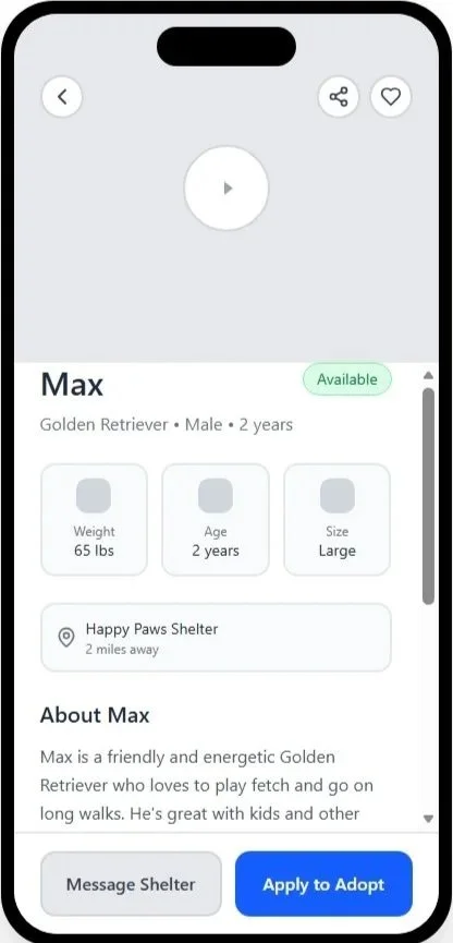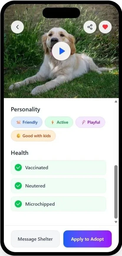 Special attention was given to simplifying complex parts of the adoption process. Visual hierarchy was used to guide users through key actions, such as browsing pets, viewing details, and completing applications, without feeling overwhelmed.