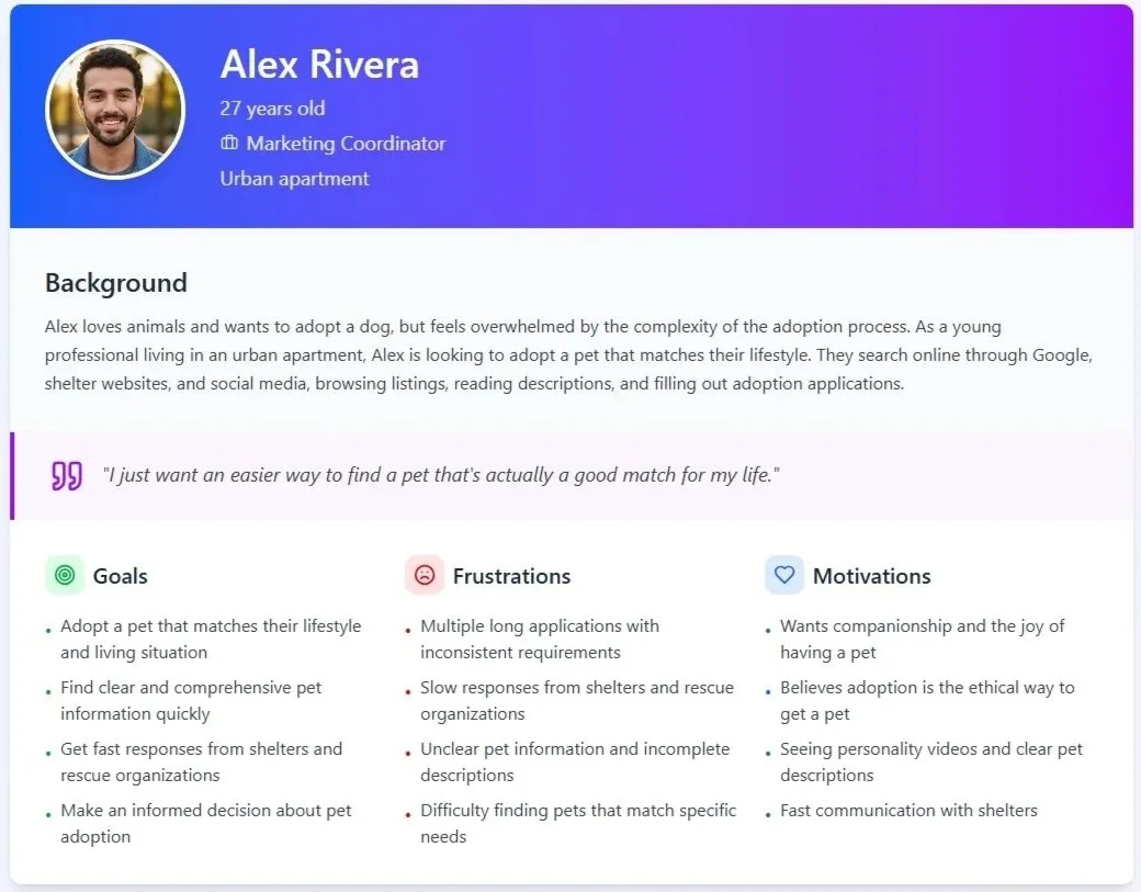 The primary goal was to synthesize the diverse needs and frustrations uncovered during my research into a single, relatable archetype. By creating Alex Rivera, I was able to: