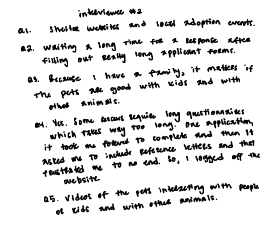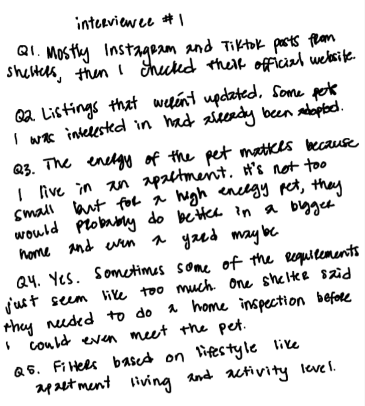 The design process for PetConnect began with understanding the challenges potential pet owners face when trying to adopt from shelters.Research was conducted through informal conversations and online observation, focusing on the adoption experience from initial interest to application. This helped uncover key pain points, including rigorous and time-consuming application processes, long wait times for responses, and unnecessary or repetitive requirements that discourage users from completing the process.These barriers often led to frustration and, in some cases, caused users to abandon adoption altogether.These insights highlighted the need for a more streamlined and accessible platform that simplifies the adoption process, reduces friction, and helps connect users with adoptable pets more efficiently.Questions asked to intervieweesHow did you start looking for a pet to adopt?